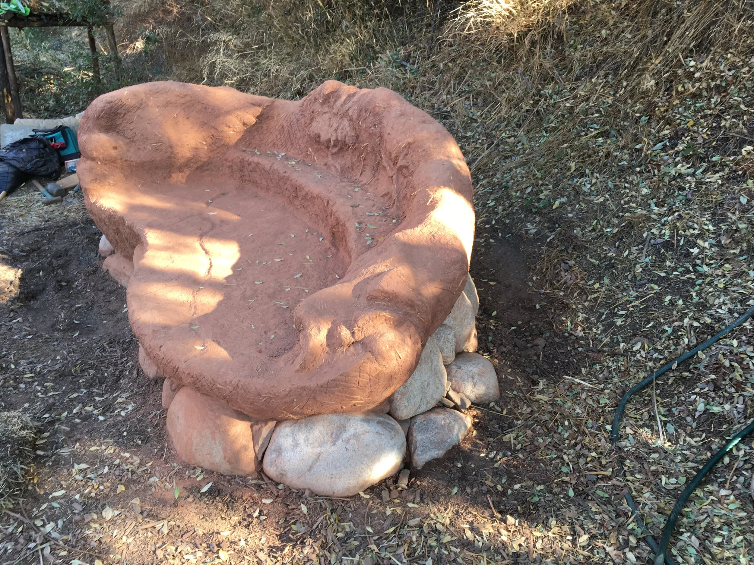 Lime Plaster on Cobb Storybook Bench Building at Earthroots Field School in Silverado Caynon, Santa Ana Mountains (weekend after Thanksgiving 11/30-12/1/2019) -